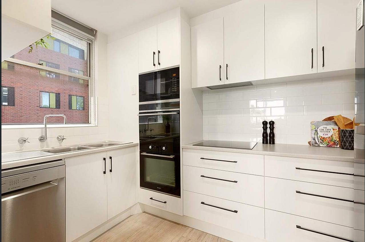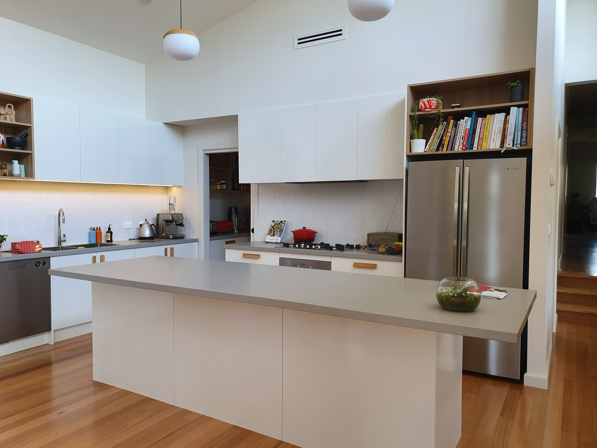 This clever kitchen refresh maintains the original L-shaped layout while adding a strategic peninsula for casual dining. New benchtop and splashback materials update the space, proving that thoughtful modifications can transform functionality without a complete renovation.