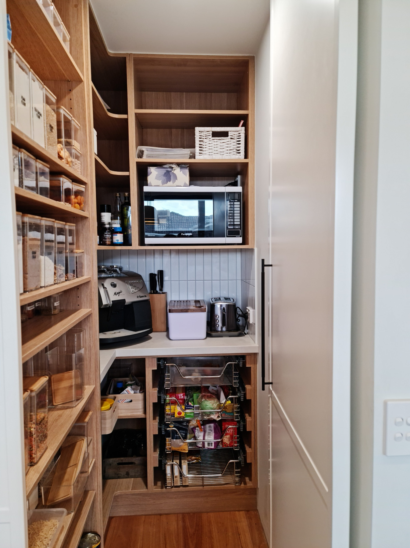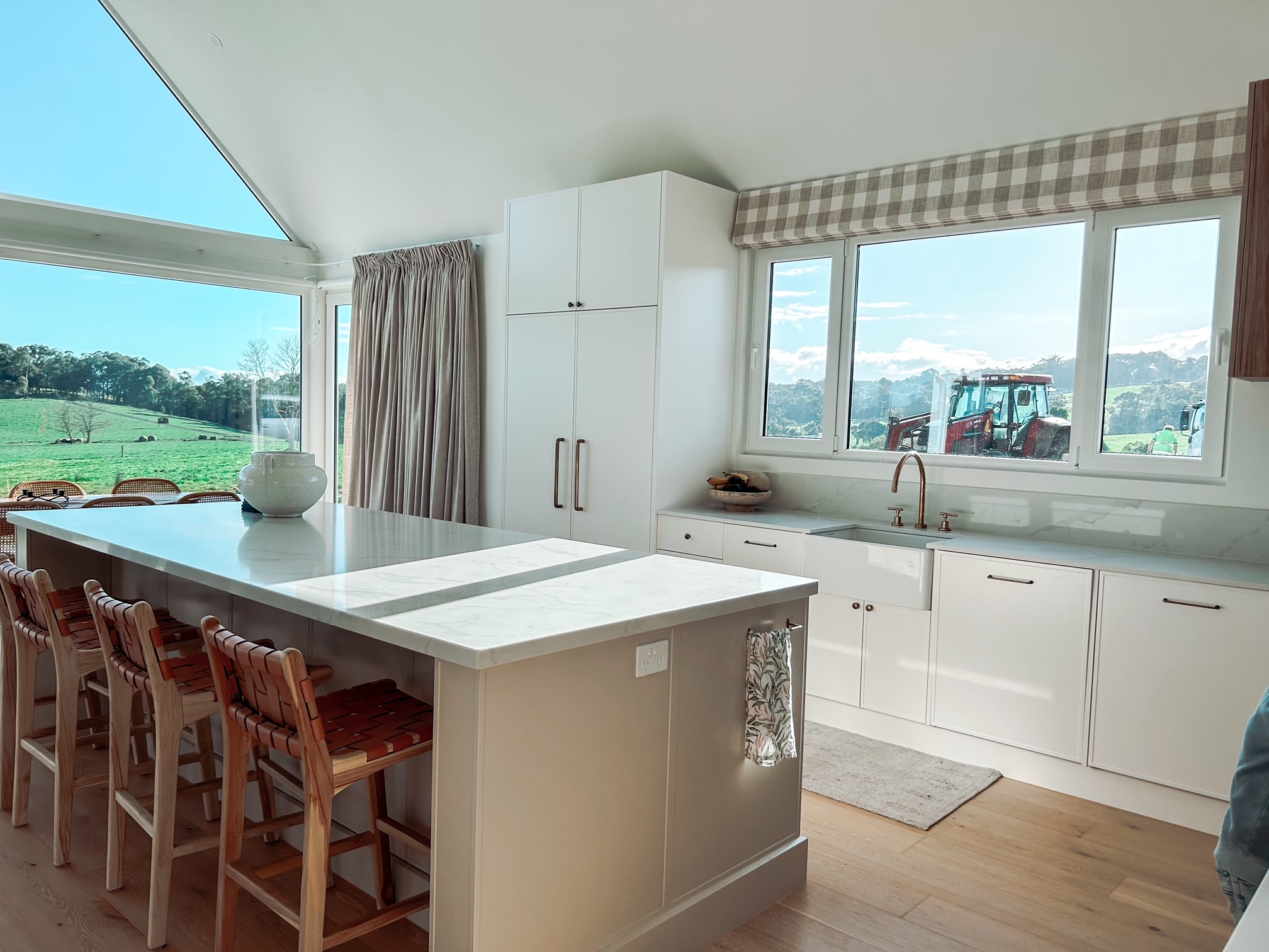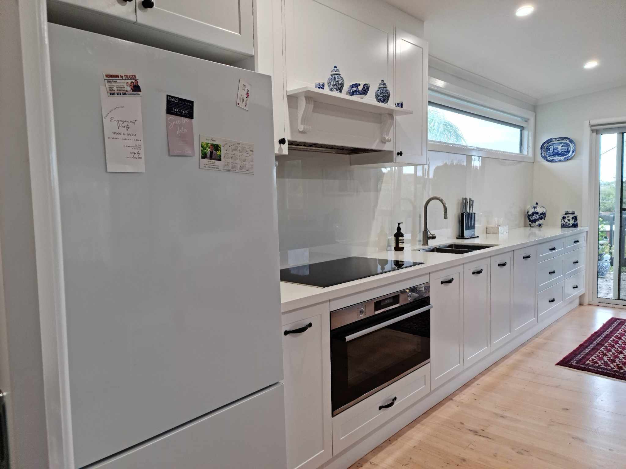 Oxford blue cabinetry pairs beautifully with white accents, while a striking Australian botanical wallpaper under glass steals the show as both splashback and island feature.