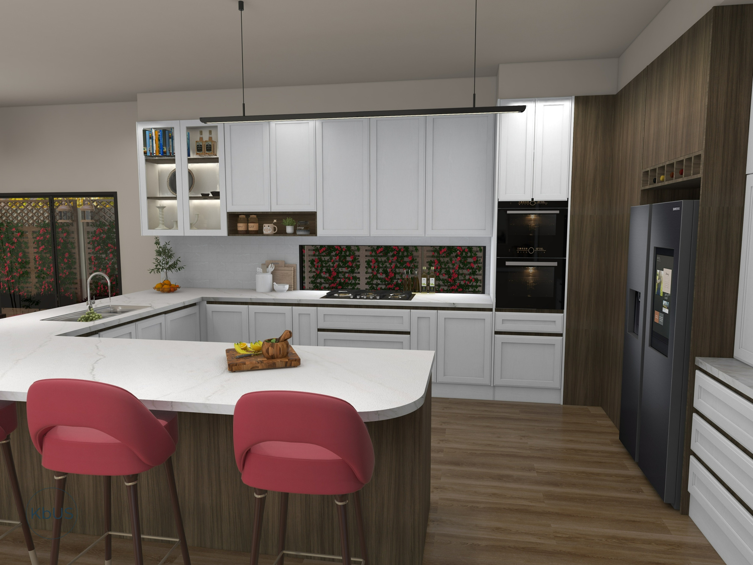 This thoughtfully designed G-shaped kitchen maximises functionality with green base and tall cabinets, complemented by crisp white overheads and appliance cabinet. The layout ensures a seamless workflow while offering ample storage and a timeless colour palette.