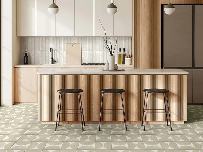 Accessories: Geometric tiles, sleek hardware, and retro-inspired lighting.