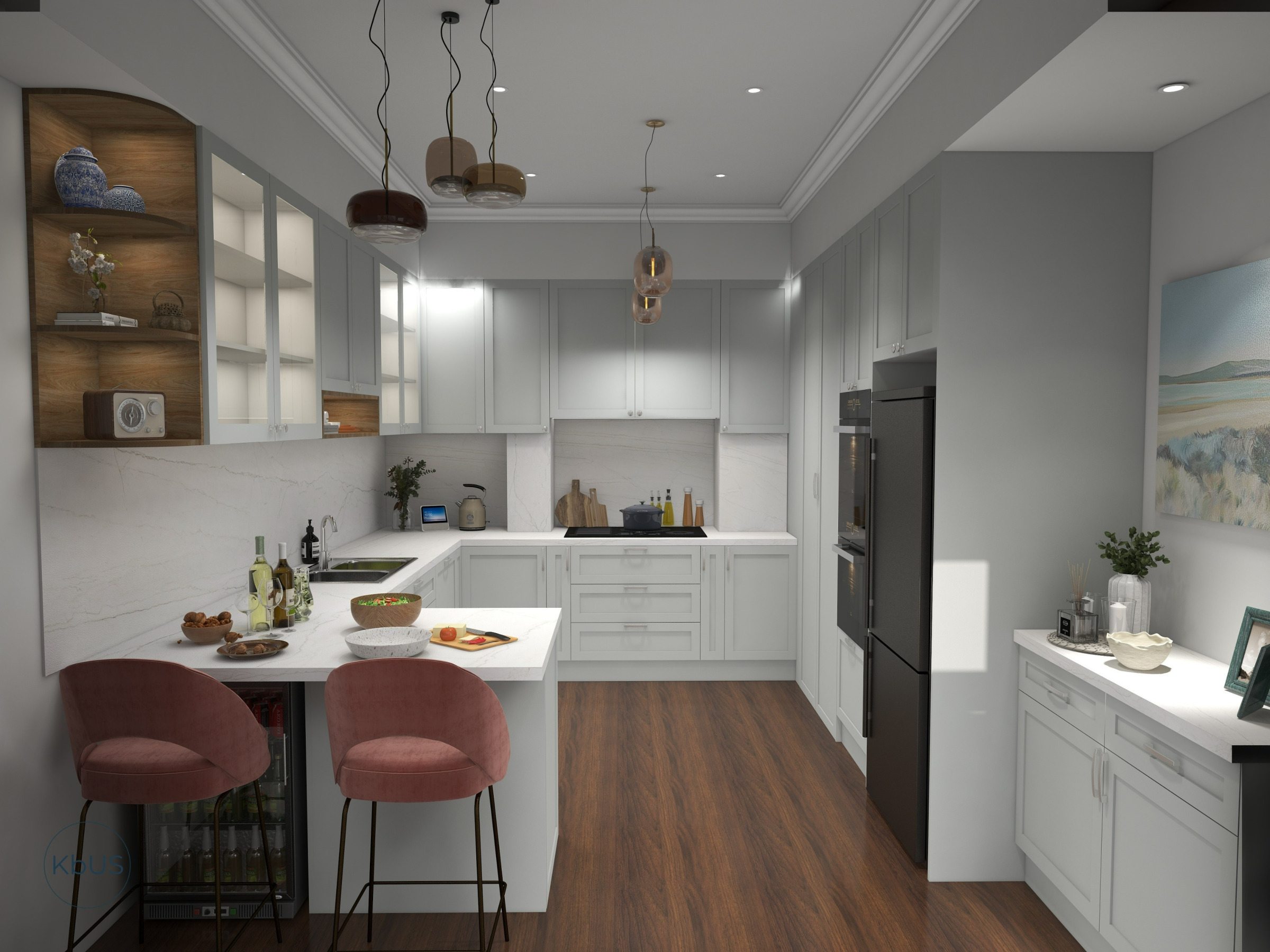 This warm beige kitchen extends into the dining and living areas, offering a true sense of flow and connectivity. Rendering the full space provides a clear vision of how design elements come together for a cohesive and functional home.