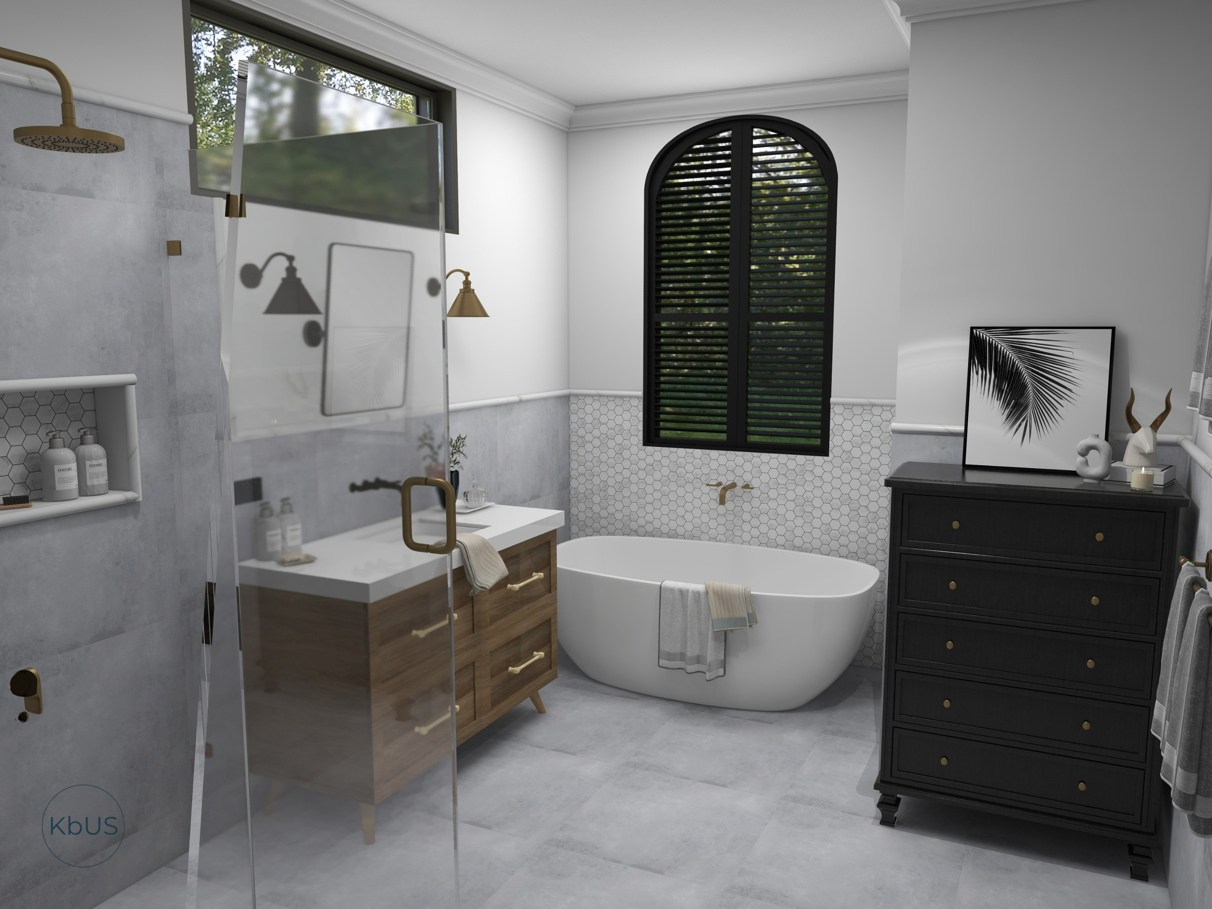 Designed by Yeomans Tile Centre in Eltham, this classic bathroom exudes heritage charm with black accents, oak details, and classic marble tiles. A beautiful freestanding bath, elegant wall sconces, and a stunning mirror complete the refined look.