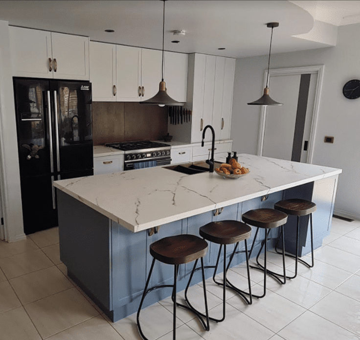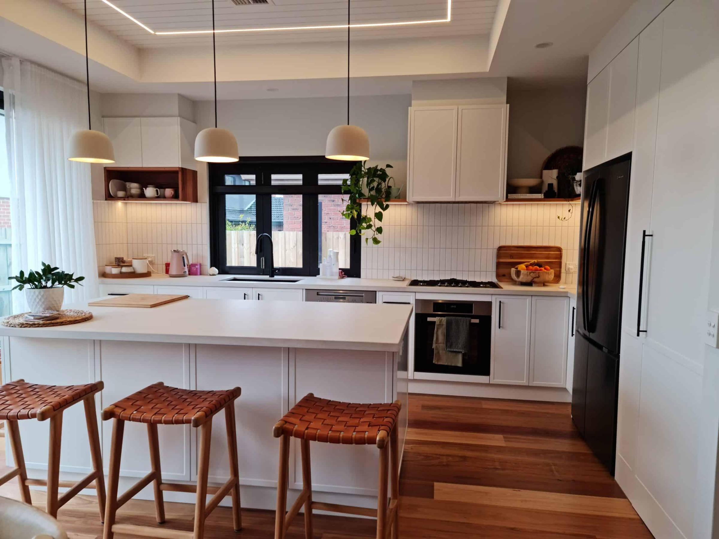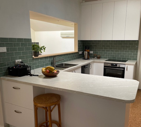 This clever kitchen refresh maintains the original L-shaped layout while adding a strategic peninsula for casual dining. New benchtop and splashback materials update the space, proving that thoughtful modifications can transform functionality without a complete renovation.