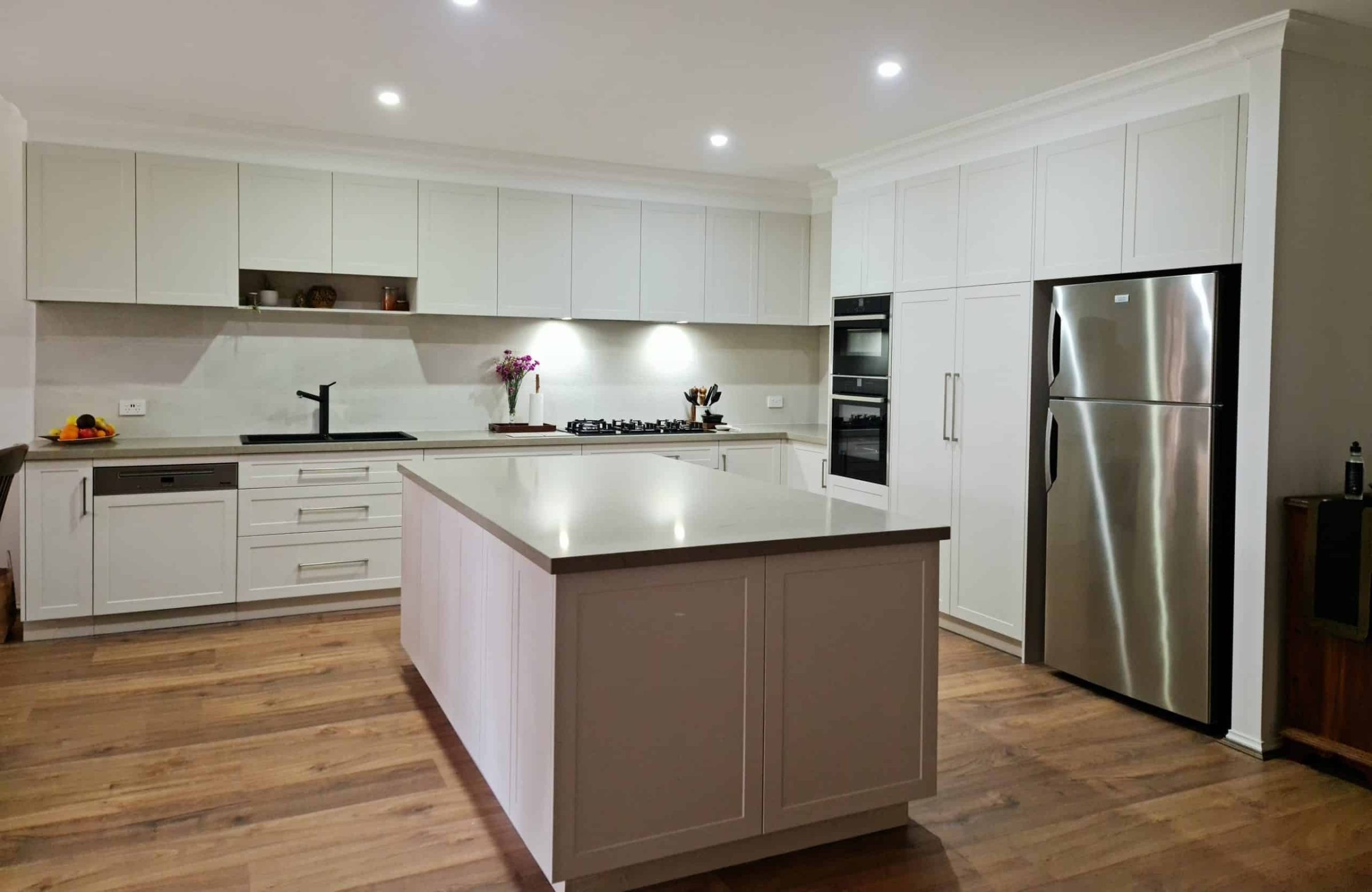 This timeless kitchen renovation embodies enduring Australian style with crisp white cabinetry and elegant Carrara-style surfaces. The subtle wall colour adds personality while maintaining the bright, fresh aesthetic that suits any home.