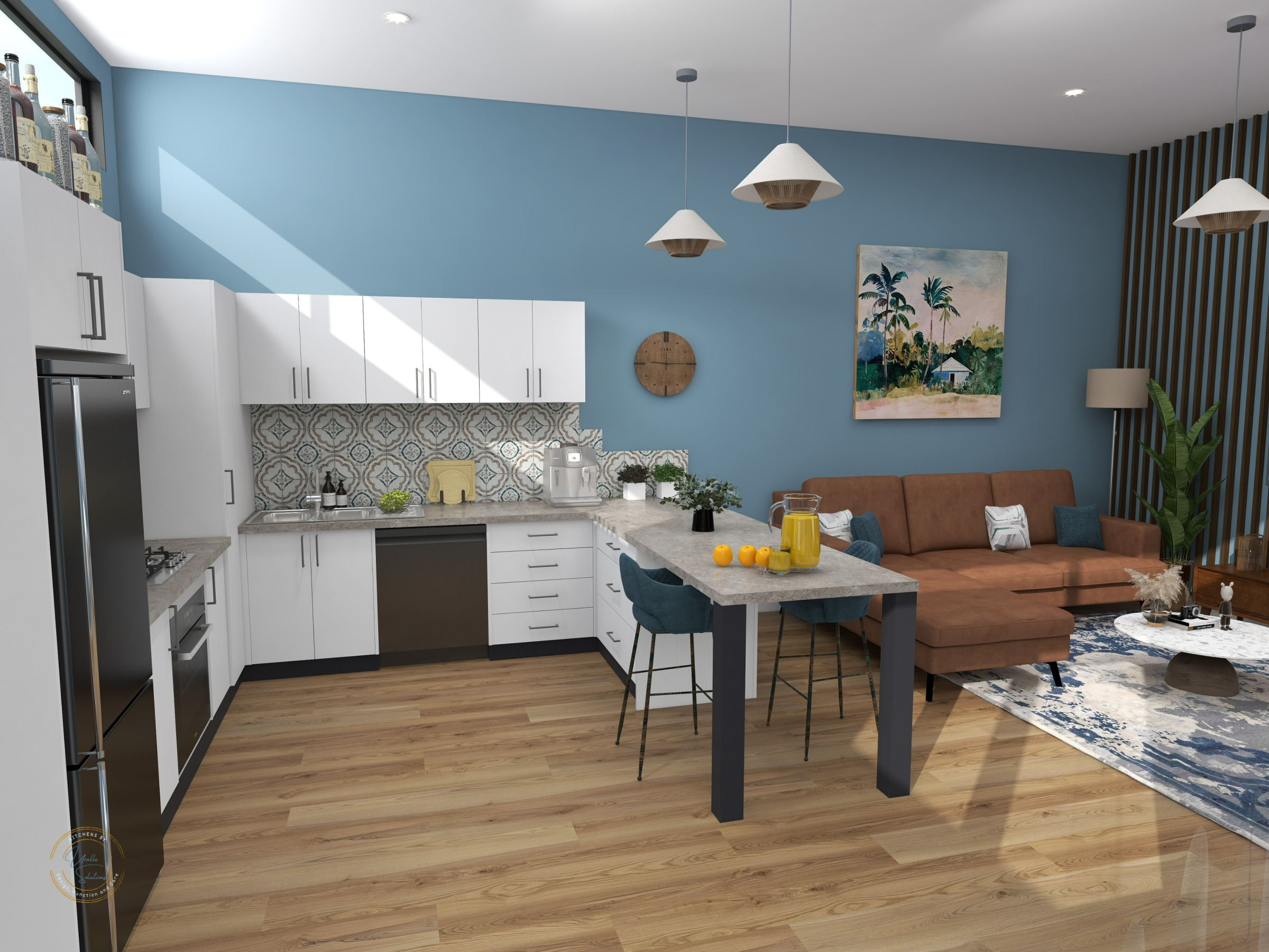 Mint, blue and vibrant orange patterned splashback, traditional cabinetry, and terrazzo flooring bring timeless Mediterranean warmth and style, complete with abundant storage solutions.