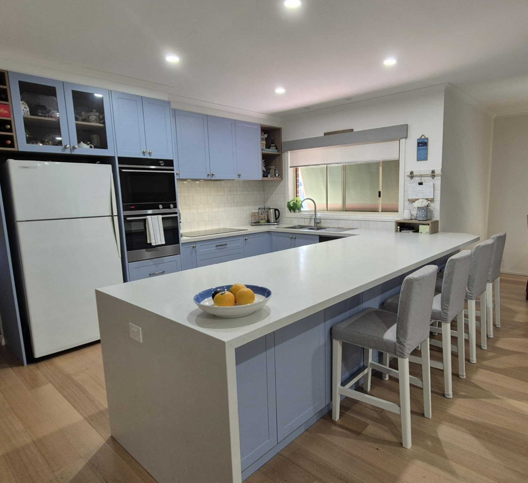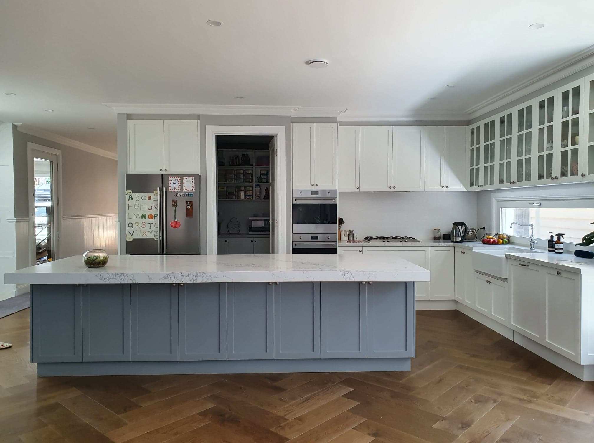 Oxford blue cabinetry pairs beautifully with white accents, while a striking Australian botanical wallpaper under glass steals the show as both splashback and island feature.
