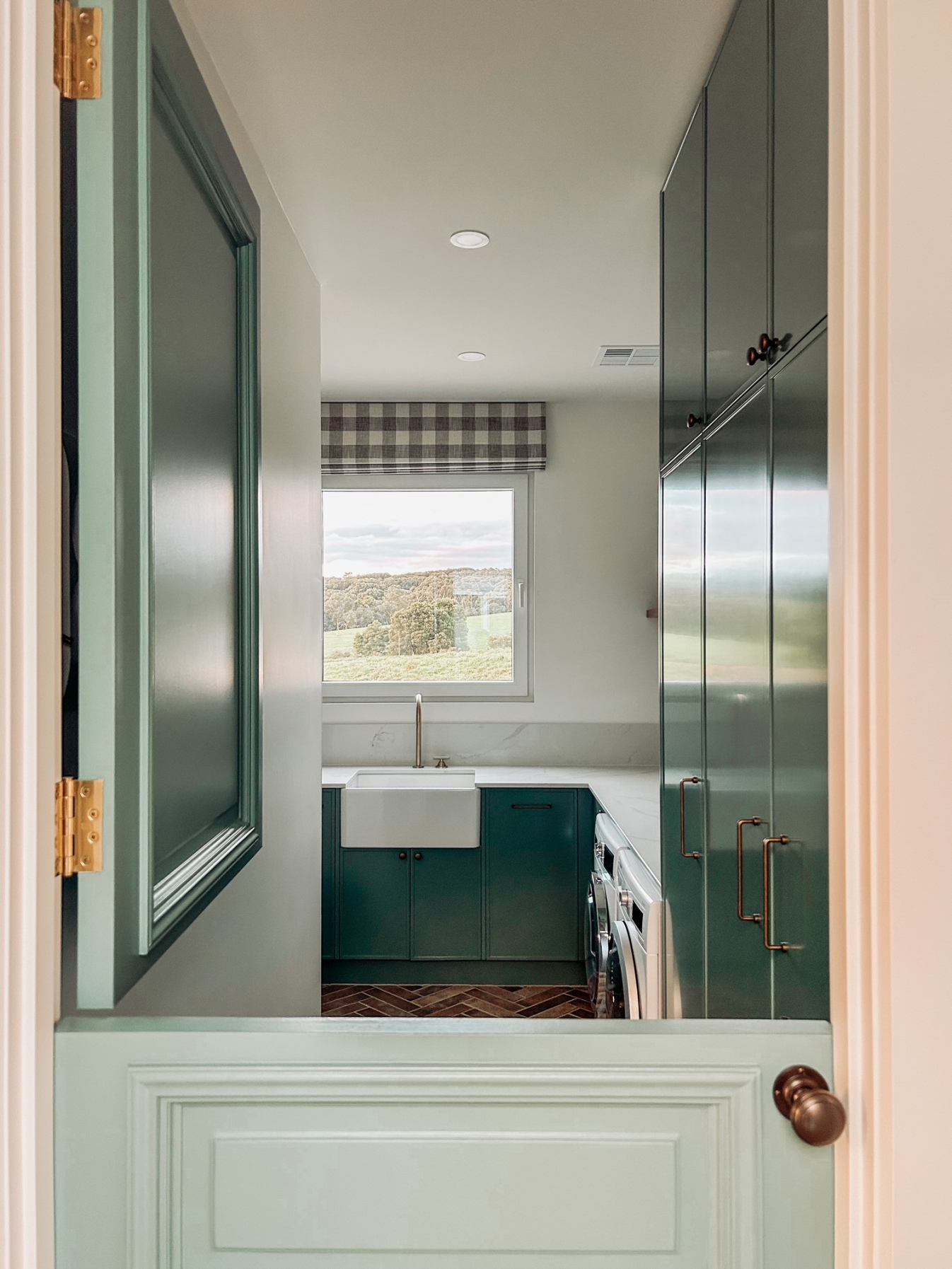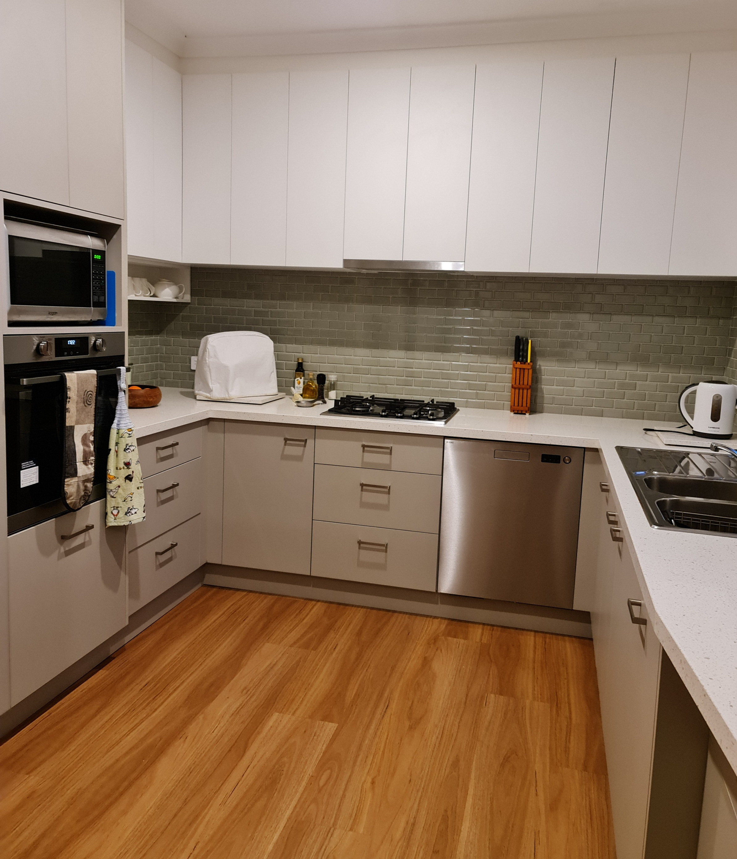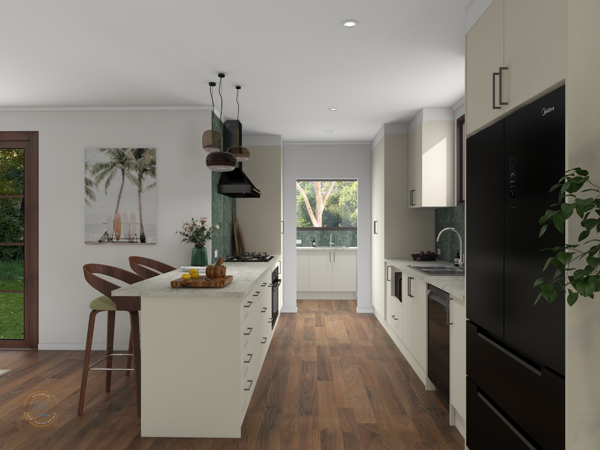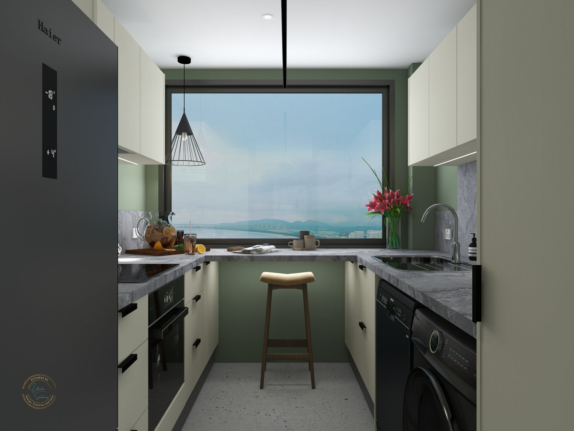 This intimate galley kitchen marries style with smart design through warm papyrus cabinets and grey stone surfaces. Set against serene green walls, the continuous benchtop flows across the window, creating a cosy café-style nook perfect for harbour-view dining.