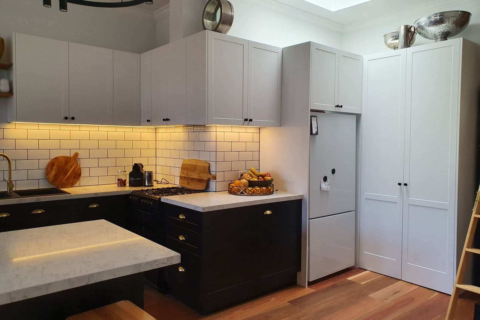 Honouring Melbourne's terrace house character, this kitchen blends soft grey satin Shaker cabinetry with traditional handles and luxurious Dekton surfaces in Neural velvet finish. Thoughtfully designed bulkheads add architectural refinement while concealing modern necessities.
