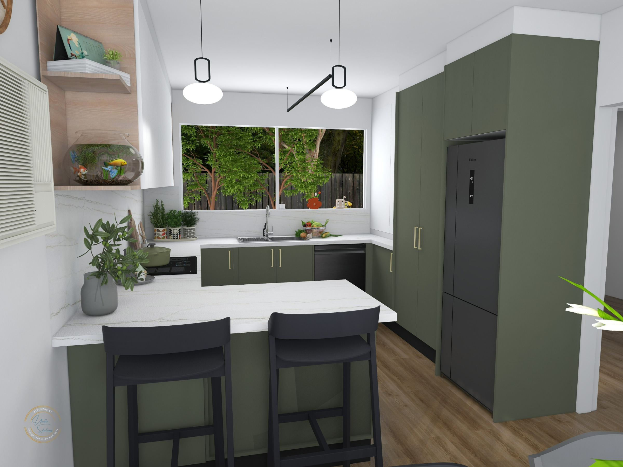This thoughtfully designed G-shaped kitchen maximises functionality with green base and tall cabinets, complemented by crisp white overheads and appliance cabinet. The layout ensures a seamless workflow while offering ample storage and a timeless colour palette.